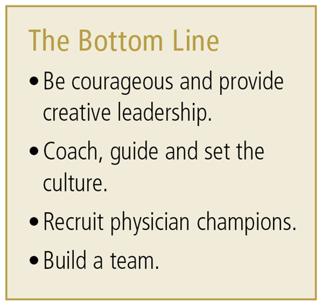 Build a team. Leading today’s healthcare organizations into a new era may require different expertise and fresh perspectives. A CEO needs to build an appropriate team to lead and support the move to value-based care and population health management. This team might require nontraditional or new leadership roles, and existing leadership teams may need to be reconfigured to support this work.