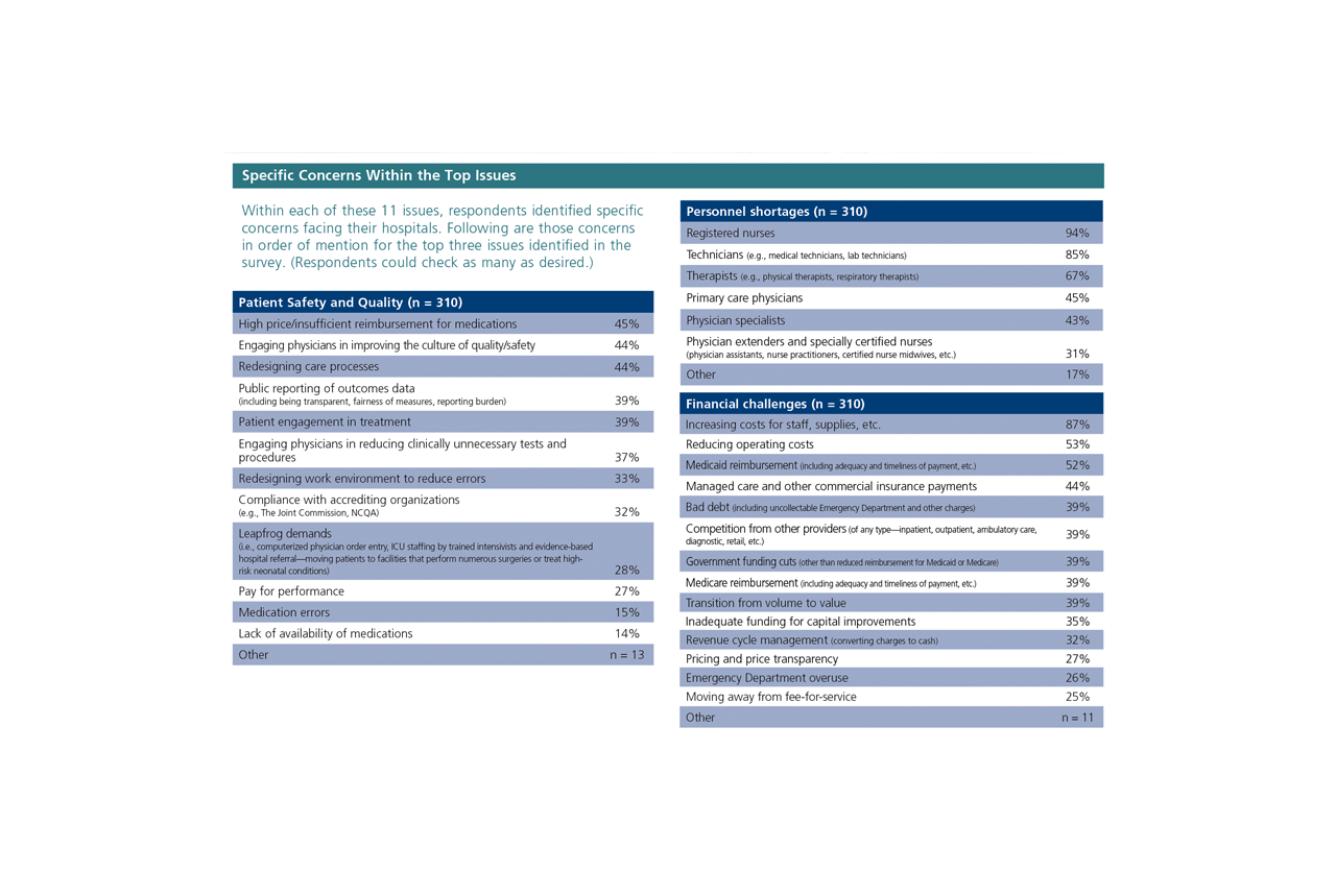 Personnel shortages ranked No. 1 on the list of hospital CEOs’ top concerns in 2021, replacing financial concerns—the top issue since 2004, according to ACHE’s annual survey of top issues confronting hospitals. This survey, sent in the fall to community hospital CEOs who are ACHE members, asked respondents to rank 11 issues affecting their hospitals in order of how pressing they are, and to identify specific concerns within each of those issues. The survey was sent to 1,327 community hospital CEOs, of whom 310, or 23%, responded. This year, respondents cited personnel shortages as their top concern, giving it an average rank of 1.6 on an 11-point scale, underscoring the workforce challenges seen during the pandemic. Financial challenges ranked second, with an average rank of 4.1. Patient safety and quality ranked third, with an average rank of 5.0.
