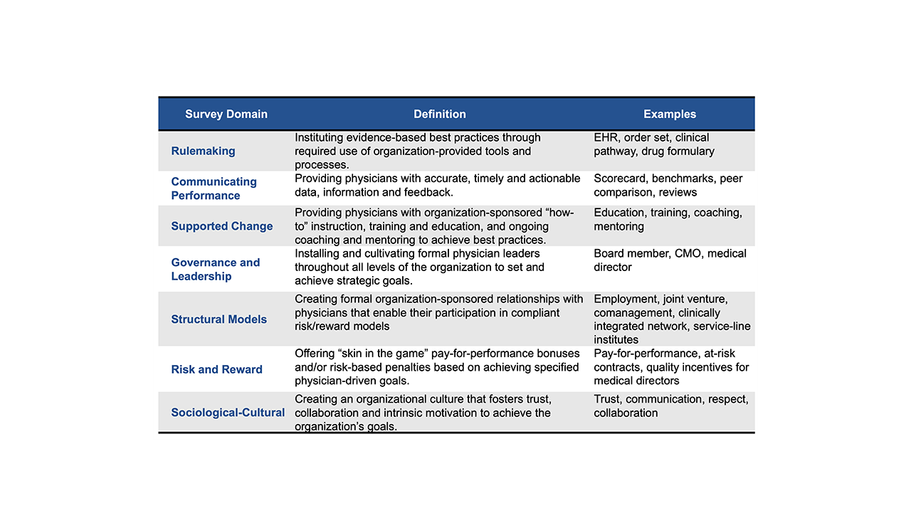 Key strategies identified included engaging physicians at all levels of the organization, sharing both clinical and financial performance measures, providing practical training and education, and offering at-risk compensation.